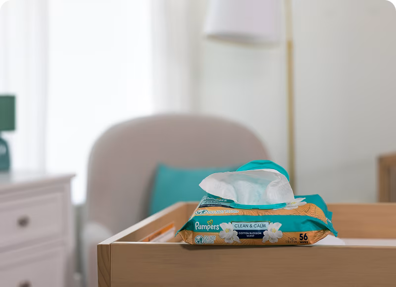 Delightfully scented wipes that can clean any mess. Use Pampers Clean & Calm Cotton Blossom scented wipes for a refreshing clean.